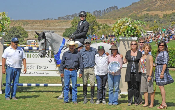 Socrates de Midos with Michelle Parker in the saddle wins the Showpark Grand Prix in Del Mar, August 2011. From left to right: Salvador Alvarado, Armando Gonzales, Alejandro Alvarado, Albert Pinella, Tula Pinella, and horse show staff including Robert Ridland.